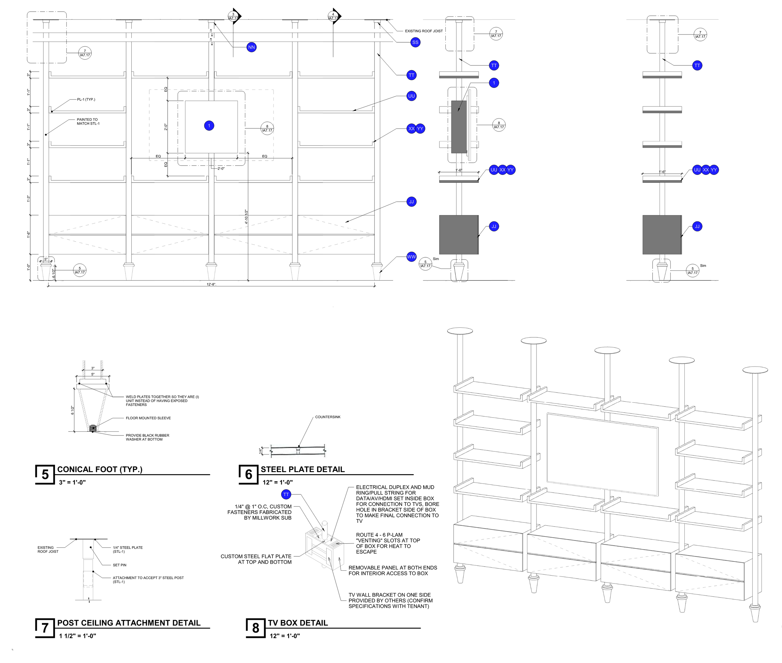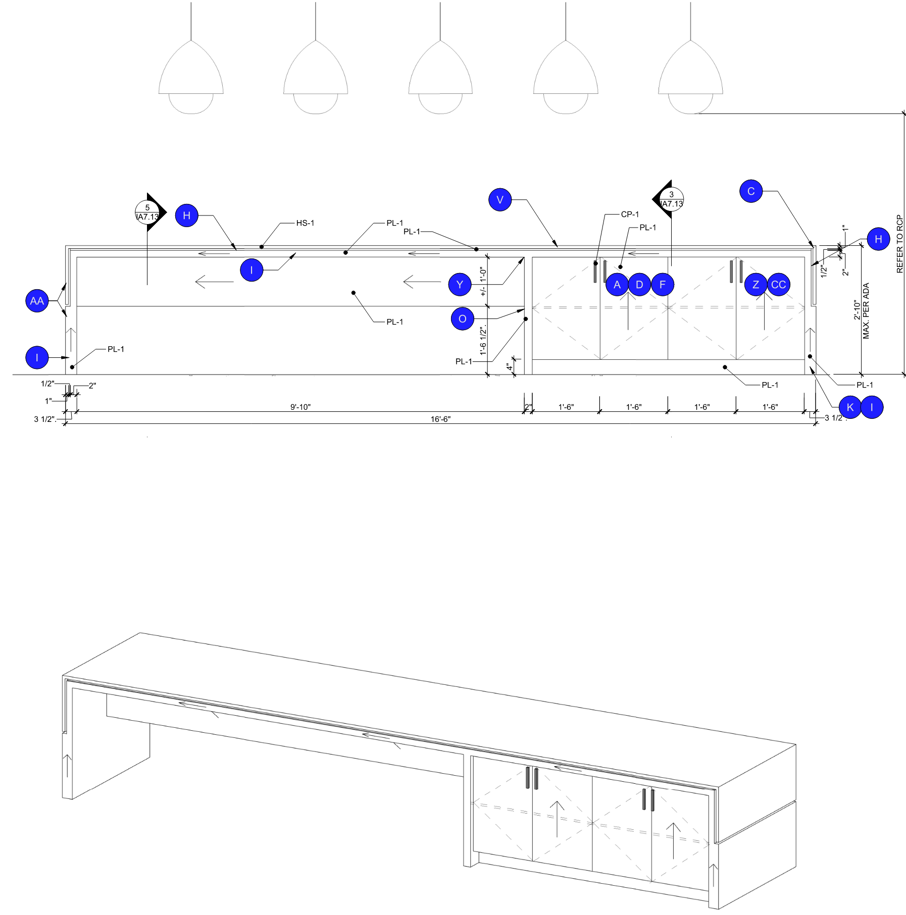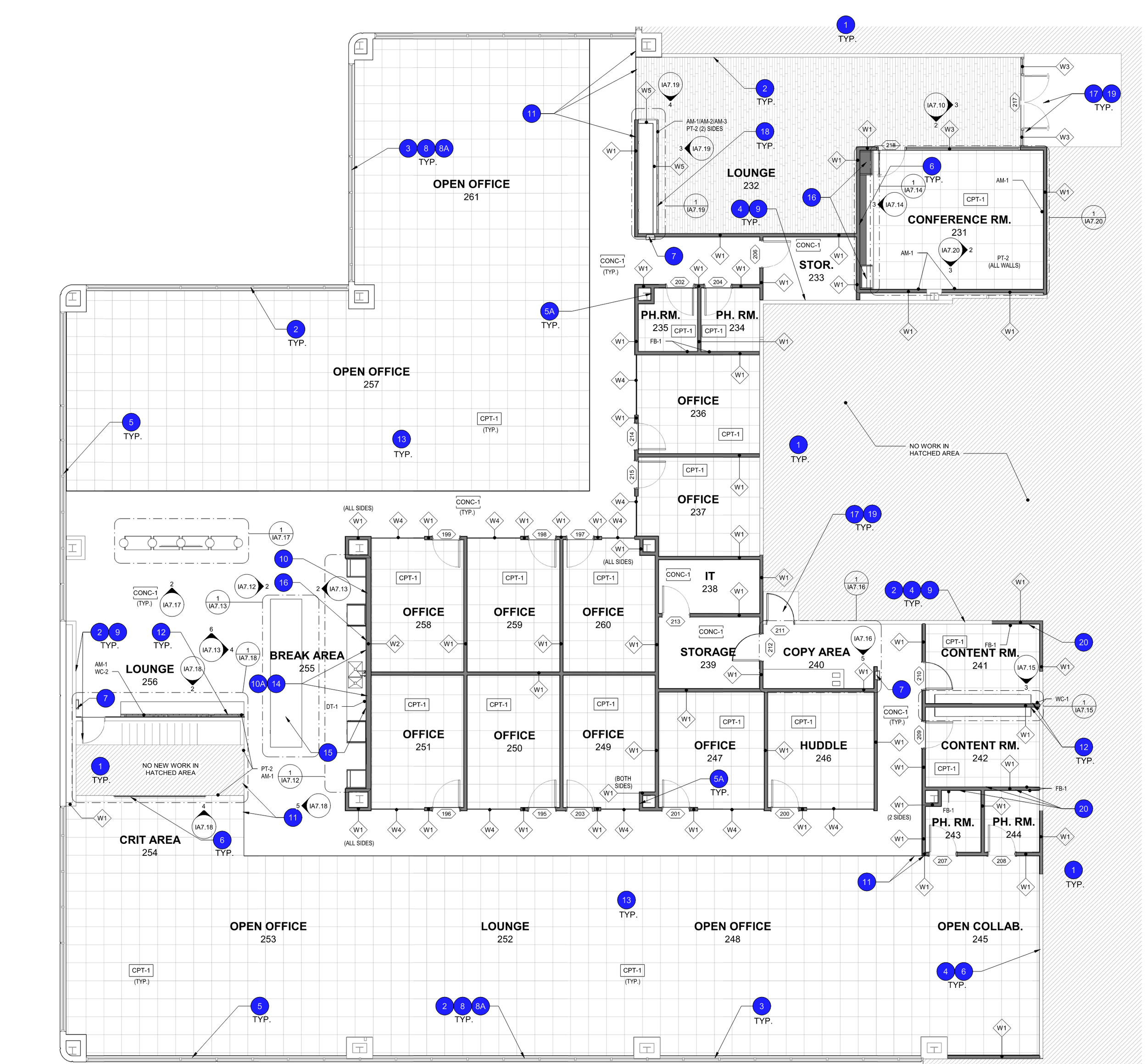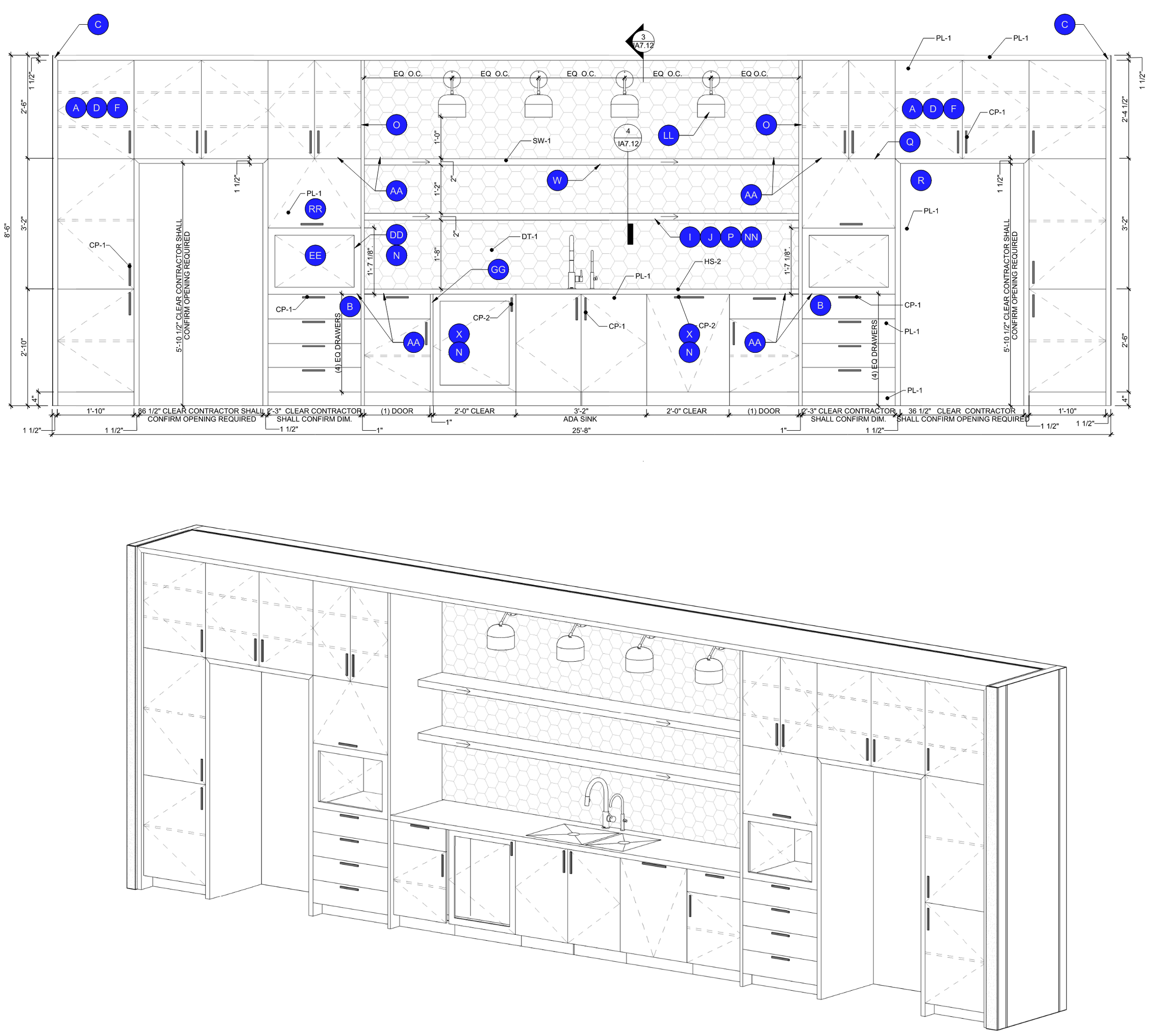 Standardized break area and island millwork systems were developed for tenant suites at Bond to provide functional kitchenette and gathering spaces. The drawings illustrate keynotes used to communicate materiality, dimensions, and construction intent to the general contractor. While the overall design language and finishes remain consistent across all suites, cabinet layouts, island sizes, and configurations vary from suite to suite based on space, tenant needs, and layout requirements. Lighting and backsplash selections are adapted per tenant, while maintaining a cohesive project-wide aesthetic.